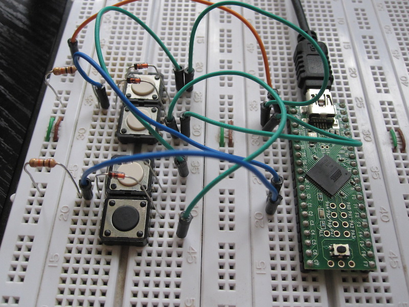 A full-sized 104-key keyboard could have 18 rows and 6 columns but we’ll simply have a humble 2x2 keyboard matrix for starting up. This is the schematic: